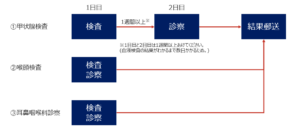 ①甲状腺検査を含む複数の検査を選択した場合は、2日間の通院が必要です。1日目は検査のみ行い、2日目に診察をします。